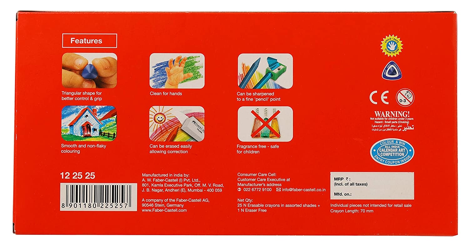 Special shapes and sizes for all to assist with early age drawing and motor skills development. Smooth bright color rich sticks, clean for hands, non toxic and food grade pigments, safe for children ages 3+. Wide range of specially developed shapes and size which guide children through the various stages of physiological and psychological development. Superior formulation-non waxy, extra smooth flow of colors which does not come off the paper. Rich bright colors. Non-toxic.